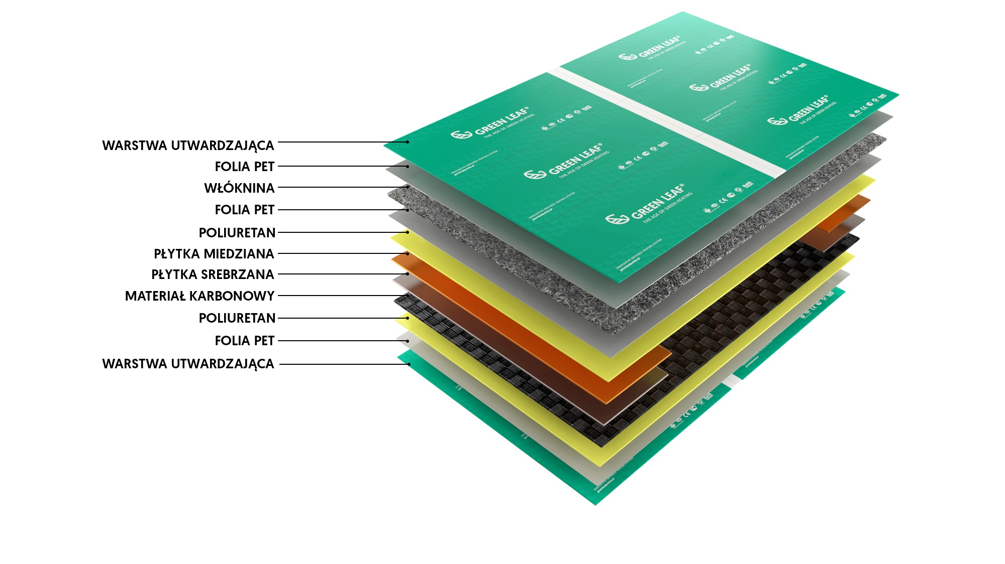 Powlekana folia grzejna na podczerwień GREEN LEAF® typu All-Coated zbudowana jest z maty włókien węglowych i pasty karbonowej, pokrytej warstwami poliuretanu i folii PET. Wielowarstwowa struktura zapewnia niezwyklą trwałość produktu, odporność na uszkodzenia mechaniczne i upływ czasu, potwierdzoną 25 letnią gwarancją. Czas nie ma wpływu na sprawność grzewczą folii, mata karbonowa nie wypala się i nie ulega degradacji, tak jak ma to miejsce w przypadku niskiej jakości folii typu drabinkowego. Folie GREEN LEAF® typu All-Coated rozgrzewają się bardzo szybko i równomiernie na całej swojej powierzchni, zapewniając krótki czas nagrzewanych pomieszczeń. Dzięki temu nie powstają cieplejsze i chłodniejsze obszary jak ma to miejsce w przypadku folii drabinkowych. Folie GREEN LEAF® są odoodporne na wysoka temperatura (do 100°C) jak również wodę.