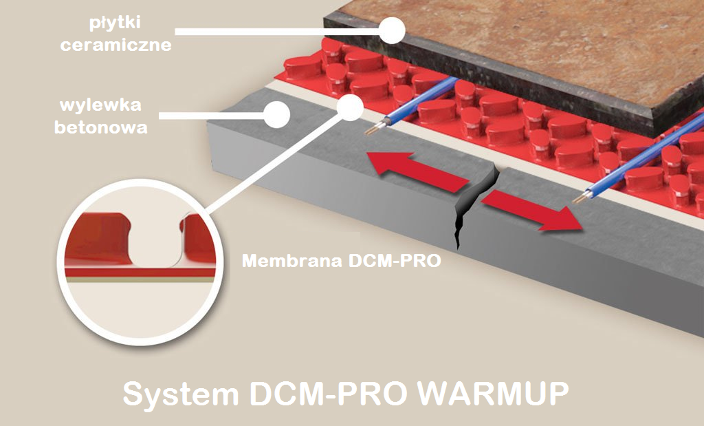 - Szybka instalacja - po prostu rozwiń membrane DCM, ułóz kabel i zatrzyj klejem wysoko elastycznym lub zalej cienką warstwą wylewki samopoziomującej