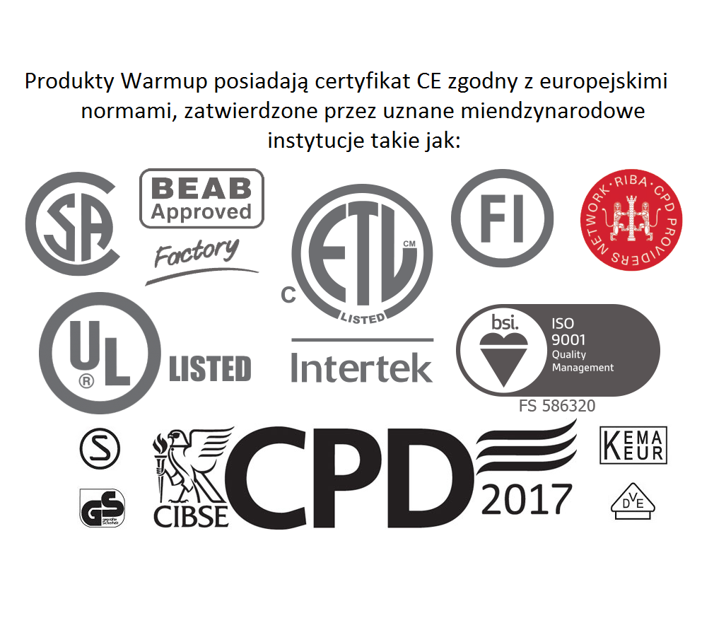 Jakość - Produkty Firmy Warmup spełnieją wszystkie normy unijne, posiadają znak jakości CE i są akredytowane przez kilka niezależnych instytucji takich jak BEAB, VDE, FIMKO, SEMKO, CSA czy UL.