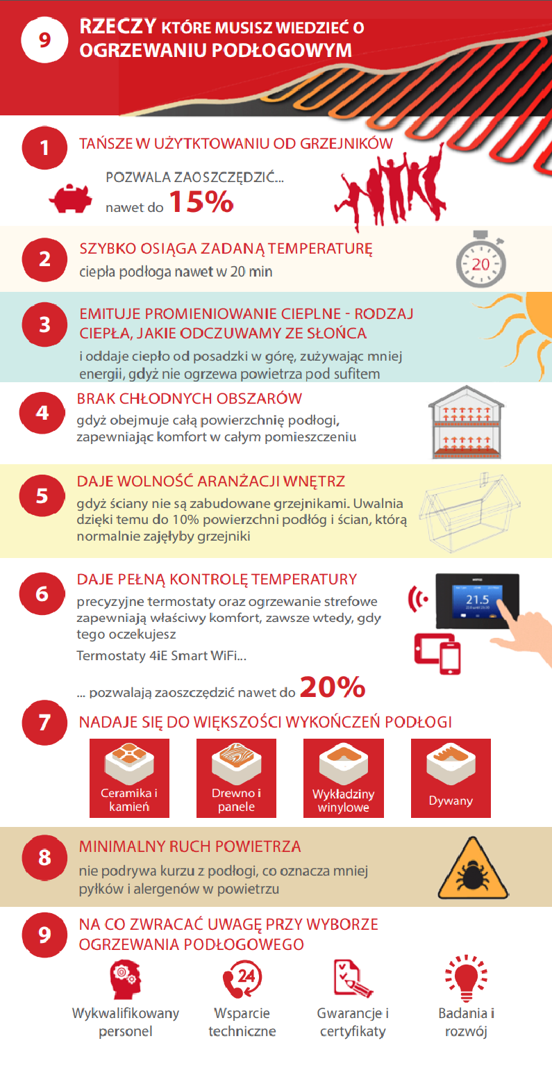 Promieniujące ciepło wytworzone przez ogrzewanie podłogowe obniża wilgotność i zapobiega cyrkulacji powietrza w pomieszczeniu, co oznacza mniej kurzu i alergenów w powietrzu wewnątrz domu. Brak jest gorących powierzchni jak w przypadku tradycyjnych grzejników co sprawia, że system grzewczy jest przyjazny dla domowników.